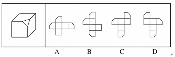 75.左边给定的是削掉一个角的纸盒,下列哪一项不是有它展开而成?