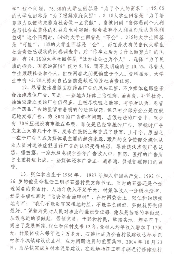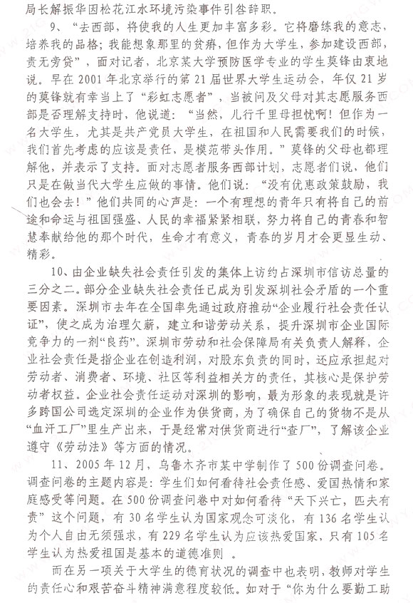 (三)请结合所给定的资料,以“责任”为主题,自选角度,自拟题目进行论述。要求:观点明确,联系实际,论述深刻,对策有效,说服有力,语言流畅。(字数在1200字左右,满分55分)