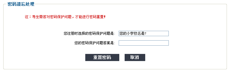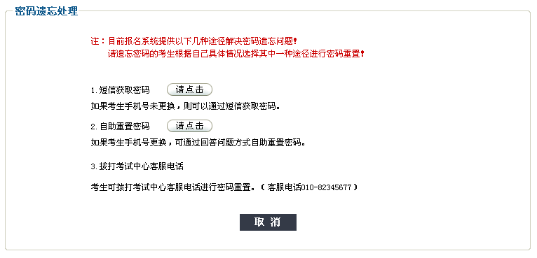 注:以上3种方式皆可重置密码,但如果考生记得密码保护问题答案,请尽量选择第2种自助方式,最方便快速地获取密码。