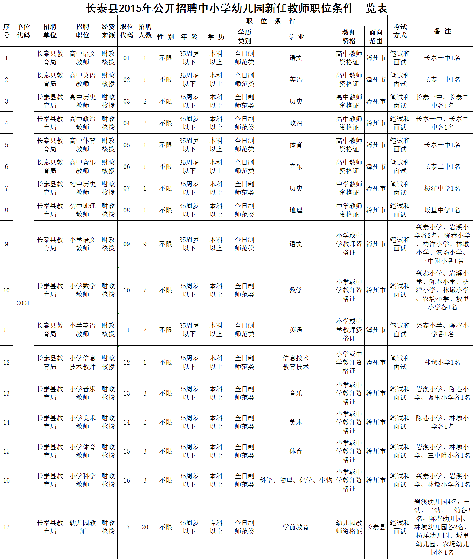 长泰县2015年公开招聘中小学幼儿园新任教师职位条件一览表 | |||||||||||||||