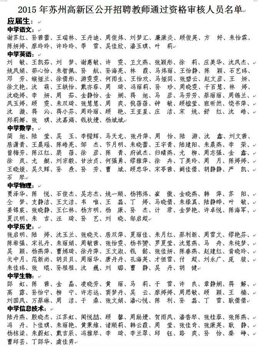 2015年苏州高新区公开招聘教师通过资格审核人员名单
