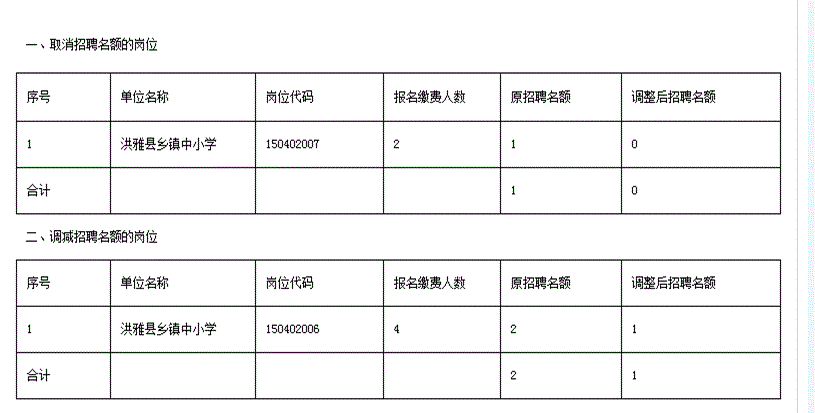 根据眉山市洪雅县人力资源和社会保障局、眉山市洪雅县教育体育局《关于做好2015年全省面向社会公开考试招聘中小学教师工作的公告》规定,招聘岗位招聘名额与有效报考人数之比不得低于1:3。未达到笔试开考比例的,调减招聘岗位招聘名额;调减后仍达不到笔试开考比例的,取消该岗位招聘。根据报考人员报名缴费情况,经研究,现对本次相关招聘岗位作如下调整(见附件)。