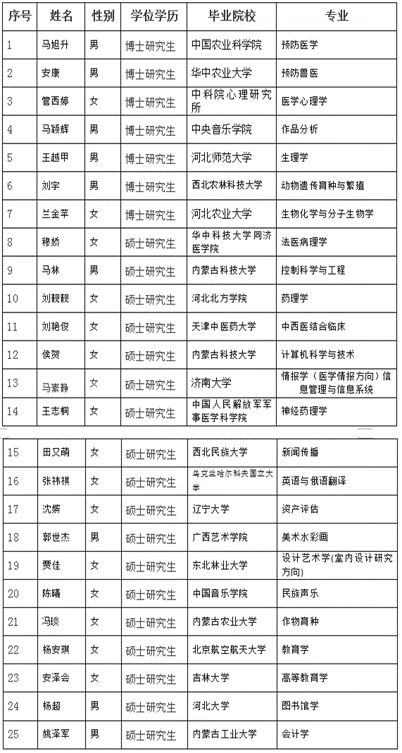 根据《河北省事业单位公开招聘工作人员暂行办法》和《河北北方学院2015年公开招聘工作人员实施方案》,我校经过资格审查、笔试、面试以及体检等程序,现将2015年公开招聘工作人员拟聘人员名单公示如下: