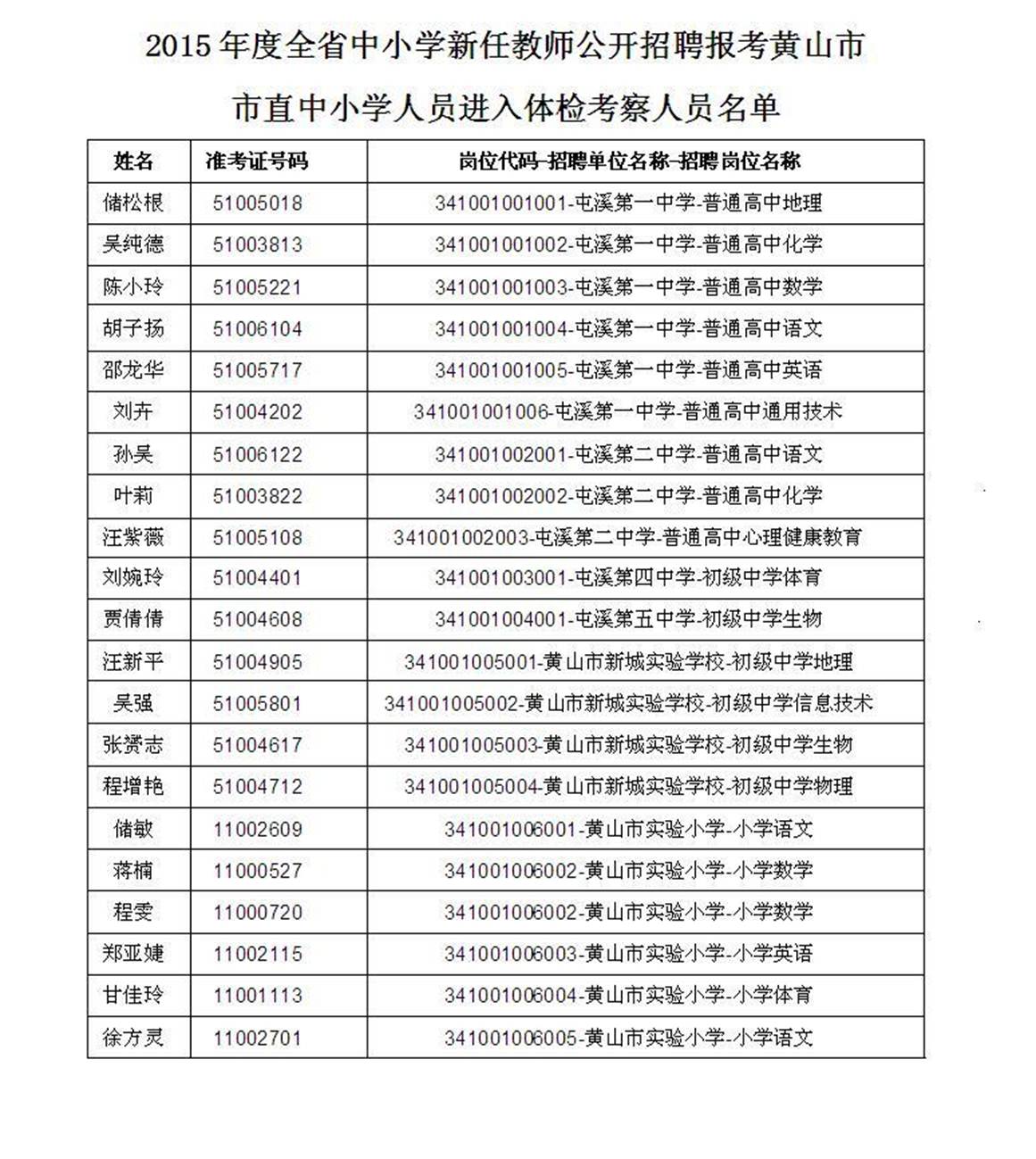 原标题:关于公布2015年度全省中小学新任教师公开招聘报考黄山市市直中小学人员进入体检考察人员名单和有关体检事项的公告