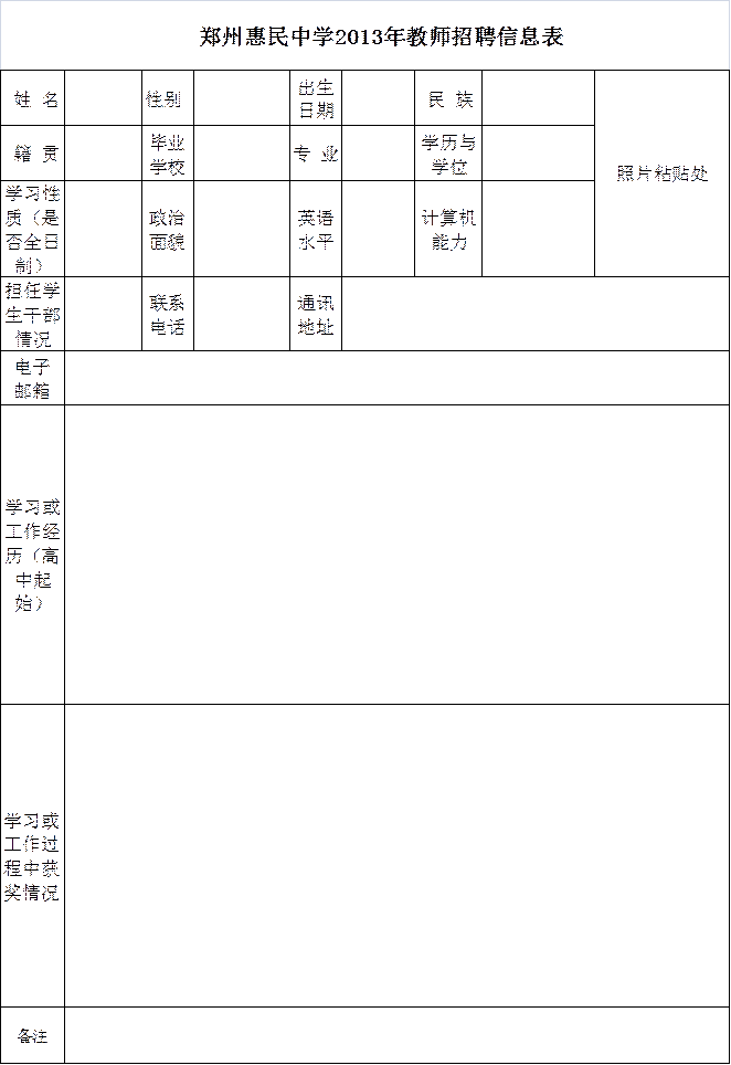 郑州惠民中学2013年教师招聘信息表.doc