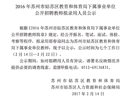 2017年02月2016江苏苏州市姑苏区教育和体育局下属事业单位招聘教师拟录用公示