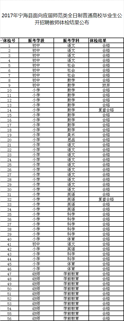 原标题:2017年宁海县面向应届师范类全日制普通高校毕业生 公开招聘教师体检结果公布