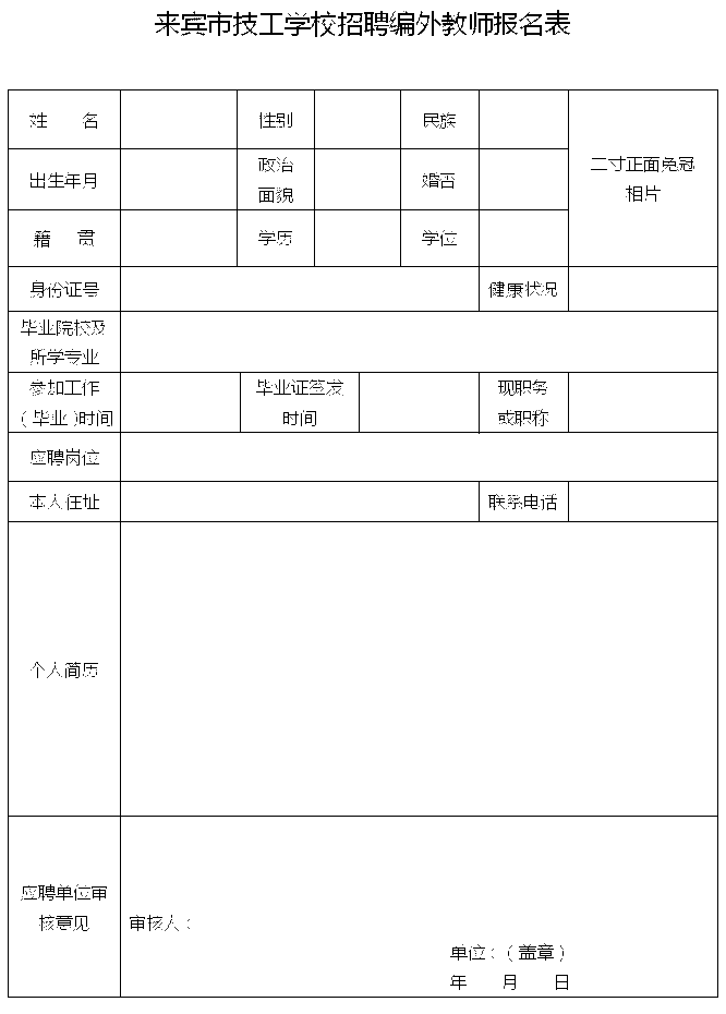 (三)报名地点:来宾市技工学校(来宾市华侨大道水韵路68号市体育馆旁)。请务必填写报名表,并将报名表、自荐材料,并附学历学位、荣誉证书等复印件,直接送达或邮寄至来宾市技工学校,或扫描(拍照)材料发送至学校邮箱:gxldjx@126.com。