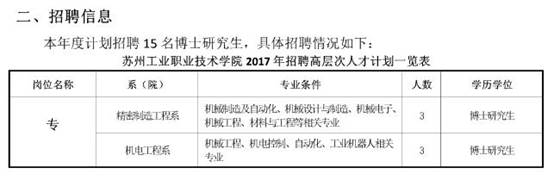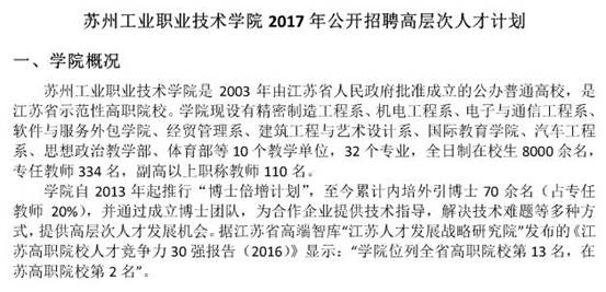 原标题:苏州工业职业技术学院2017年公开招聘高层次人才计划