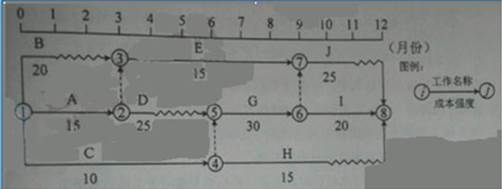 72.按最早开始时间编制的施工计划及各工作每月成本强度(单位:万元/月)如下图,D工作可以按最早开始时间或最迟开始时间进行安排。则4月份的施工成本计划值可以是()万元。