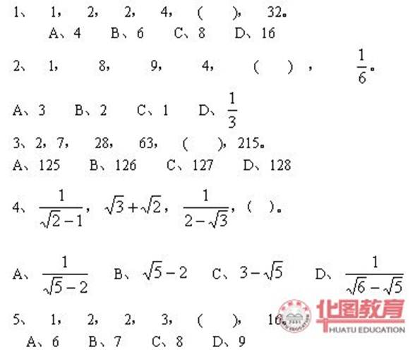 一、数字推理:共5题,每题0.5分。给你一个数列,但其中缺少一项,要求你仔细观察数列的排列规律,然后从四个供选择的选项中选择你认为最合理的一项,来填补空缺项。