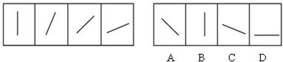 解答:在例题1中,最左边的图形中的直线是向上直立的,其后图形中的直线逐渐向右倒下。第5个图形中的直线应该恰好倒下。因此,正确答案是D。