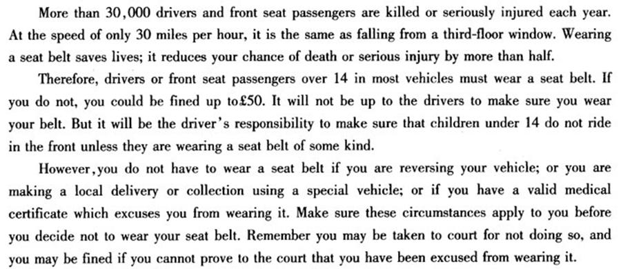 · (83). According to the text,which of the following people riding in the front do not have to wear a seat belt?()