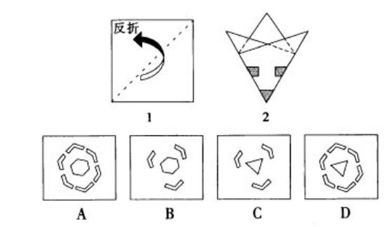 · (44). 将正方形沿着图1中的虚线对折,再折成图2所示,将黑影部分剪掉,展开后会是哪个图形?( )