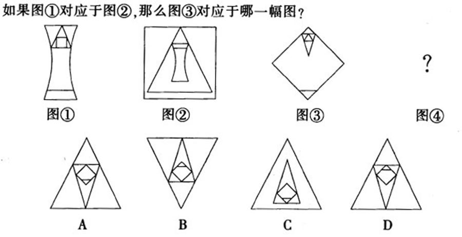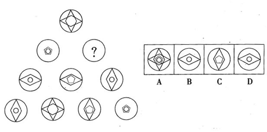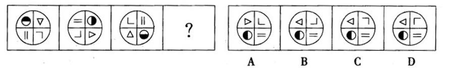 一、图形推理。请认真观察每组图形,理解其中含义,判断出它的逻辑和顺序,并在四个选项中选择你认为最正确的答案。