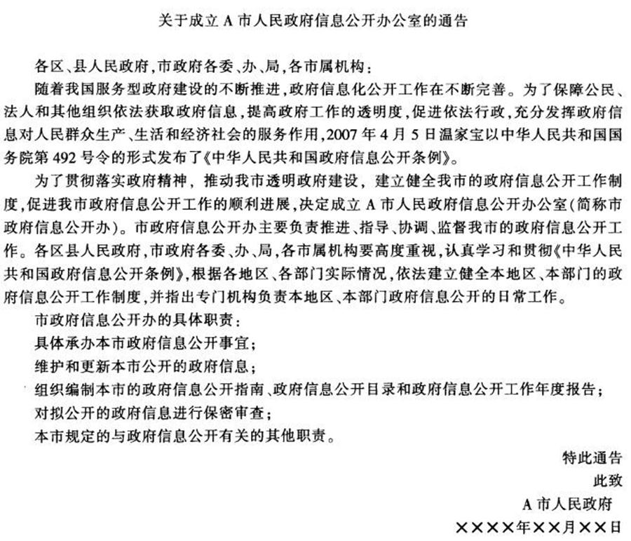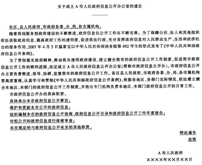 A市人民政府根据温家宝总理于2007年4月5日签署的中华人民共和国国务院第492号令发布的《中华人民共和国政府信息公开条例》,A市人民政府决定以政府办公厅的名义写一份公文,成立A市人民政府信息公开办公室(简称市政府信息公开办),下发至各区县人民政府,市政府各委、办、局,各市属机构。现把公文公布如下,请仔细检查公文中错误的地方,并在下边画上横线,且在正文下边的空白处改正。