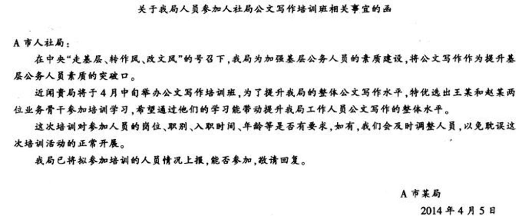 · (53). A市某局获知市人社局将于4月中旬举办公文写作培训班,决定派王某和赵某两位骨干参加培训学习,拟向市人社局询问是否能参加等相关情况,为此,请你向市人社局拟写一份公文。