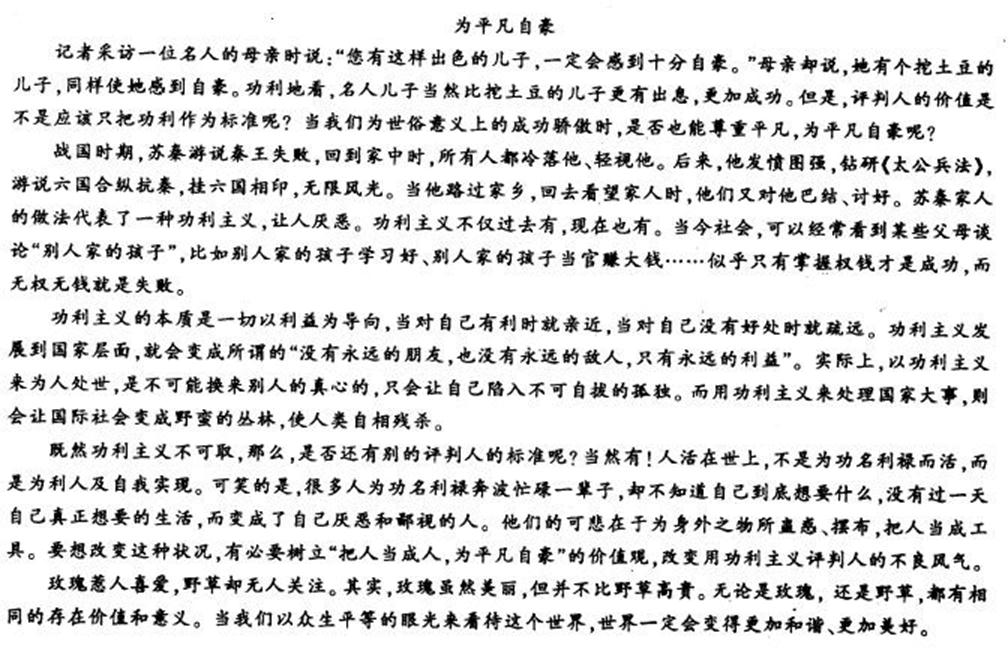 · (49). 材料:记者采访一位名人的母亲时说您有这样出色的儿子,一定会感到十分自豪。”母亲 赞同地说是的!不过,我还有一个儿子,也同样使我感到自豪,他正在地里挖土豆。”