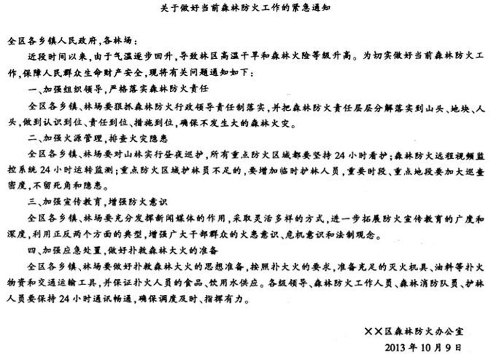 · (48). 近段时间以来,由于气温逐步回升,导致林区高温干旱和森林火险等级升高。请你以XX区森林防火办公室的名义拟写一个紧急通知,要求全区各乡镇和各林场做好当前森林防火工作,保障人民群众生命财产安全。发文日期为2013年10月9日。