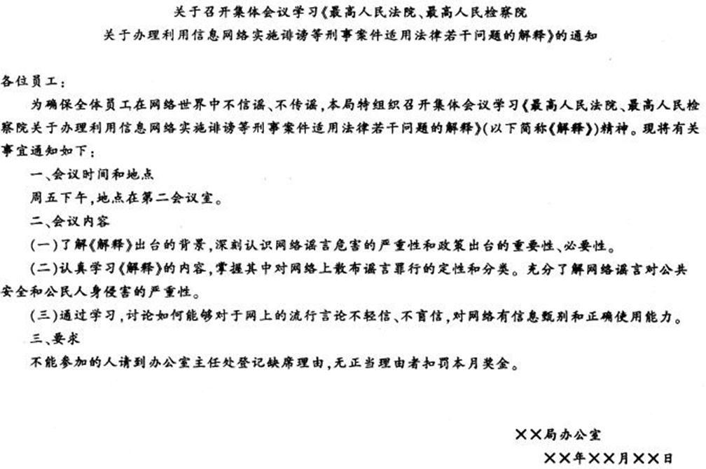 · (82). 假如你所在单位的领导要求全体工作人员在周五下午召开集体会议学习《解释》,组织大 家讨论如何在网络世界中不信谣、不传谣。地点是单位第二会议室。不能参加的人要到办公室 主任处登记为何缺席,无正当理由者扣罚本月奖金。请你以办公室的名义写一份通知。
