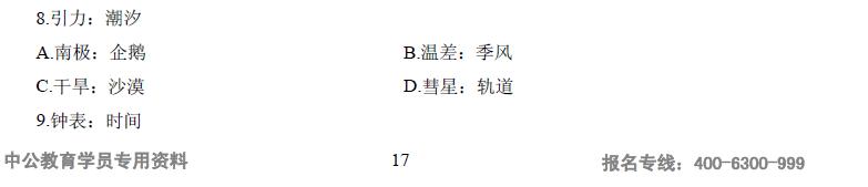 【答案】B。解析:考查词语之间逻辑关系中的因果关系,因为体温上升,所以体温计水银柱上升,因为有电,所以电灯亮。所以选择B项。