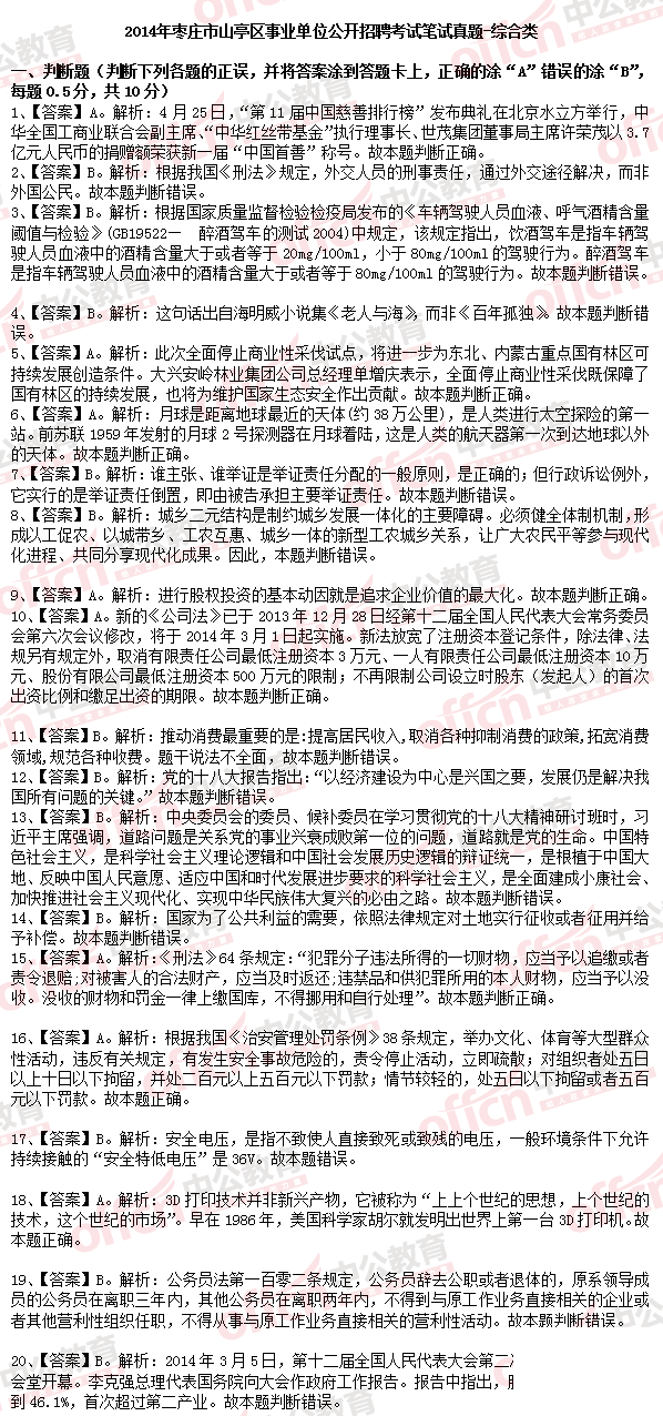 2014山东枣庄市山亭区事业单位招聘笔试真题综合类