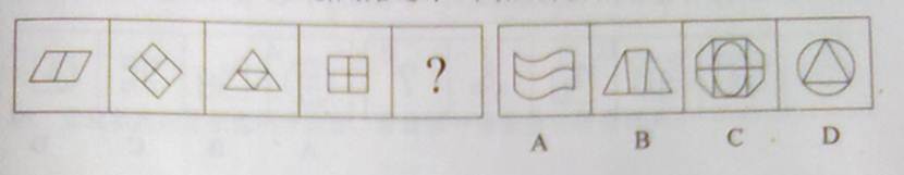 【解析】本题属于数量类。数组成部分。题干中五幅图的组成部分数分别是1、2、3、4、5,只有D项包含6部分,所以正确答案为D项。 [事业单位真题]