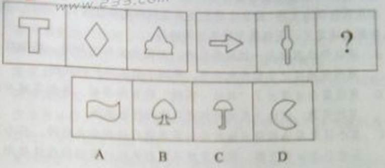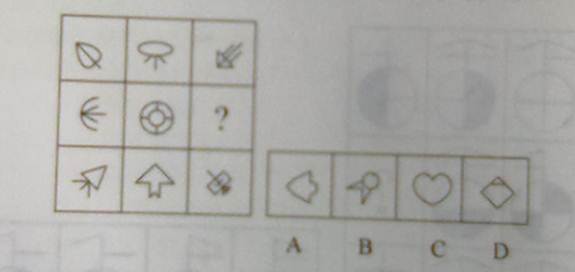 【解析】本题属于属性类。题干的这个九宫格图形每幅图都是轴对称图形,而且它们的对称轴可以组成一个“米”字形状。要求的这幅图应该是个横轴对称的图形,只有A符合要求。所以正确答案为A项。