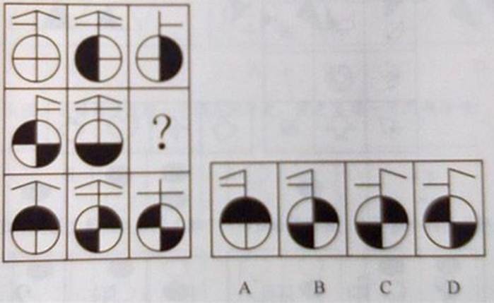 【解析】本题属于样式类。既考察了叠加,还考察了求异。这个九宫格图形中第一行和第三行都是前两幅图叠加在一起得到第三幅图。颜色叠加规律就是:白+黑=白,黑+白=黑,白+白=黑。圆球上部线的规律是求异,第三幅图是求前两幅图的不同部分。所以正确答案为A项。