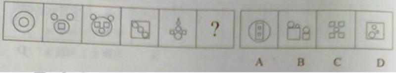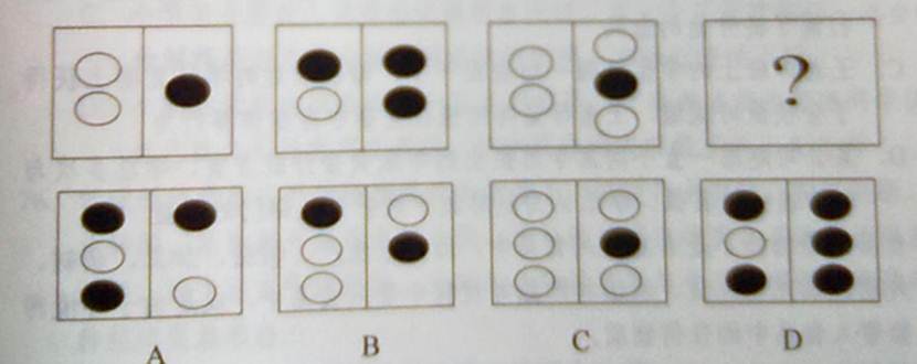 【解析】本题属于数量类。题干中给出的三幅图元素总数量为3、4、5,下个数字应该为6,答案应该在CD中选择。题干中图形还有黑圈于白圈之分,在三幅图中它们的数量规律是:2个白圈、3个黑圈、4个白圈,因此在要求的图形中应该有5个黑圈,D符合要求。所以正确答案为D项。
