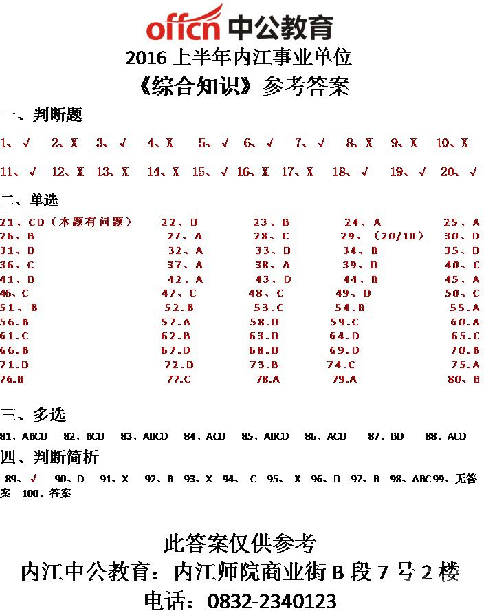 【四川省】2016年6月25日内江事业单位《综合知识》参考答案