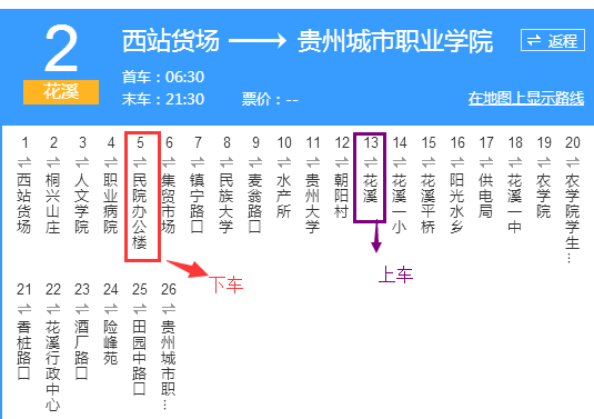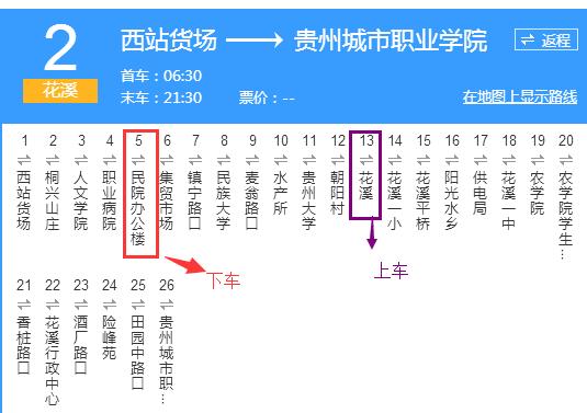 2)  乘坐223公交车,到溪北路站(终点站)下车­­­步行至花溪湿地公园门口         乘坐2公交车至民院办公楼(如图所示)