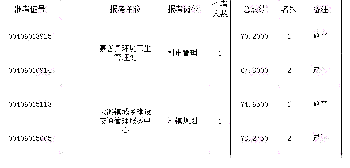 在2017年嘉善县部分事业单位公开招聘工作人员中,嘉善县环境卫生管理处机电管理岗位和天凝镇城乡建设交通管理服务 中心村镇规划岗位均有考生放弃体检。根据《2017年嘉善县部分事业单位公开招聘工作人员公告》,现将体检递补人员公布如下: