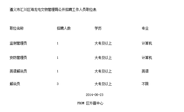 此次共计划公开考试招聘编外人员6名,用于海龙屯文物管理局的解说、计算机管理工作,具体职位详见《遵义市汇川区海龙屯文物管理局公开招聘工作人员职位表》(见附件)。