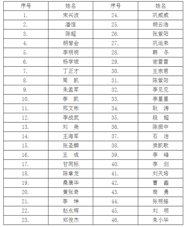 根据《烈山区2014年公开补录治安协管员公告》规定,经过报名与资格审查、体检、体能测试、面试、考察等程序,经研究确定宋兴波等46人(名单附后)为治安协管员拟聘用人员,现予以公示。公示时间为5天,从2014年10月21日至2014年10月25日。