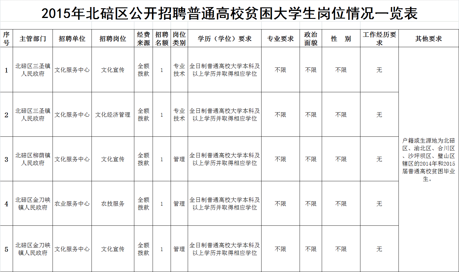 1.2015年北碚区公开招聘贫困大学毕业生岗位情况一览表;