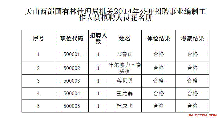 根据《2014年自治区天山西部国有林管局机关面向社会公开招聘事业单位工作人员公告》,经过笔试、资格审查、面试、体检、考察等程序,确定了拟聘用人员。现对拟聘用人员进行公示,公示时间为2015年2月4日-2015年2月10日。如对拟聘用人员有异议,请以书面、来电等方式向天西林管局纪检委监察室或天西林管局组织劳动人事处反映。
