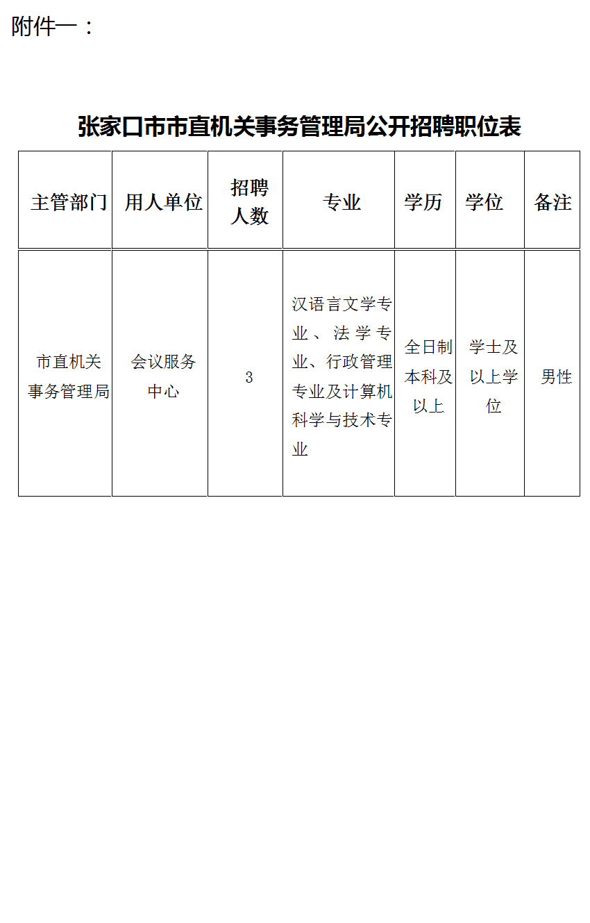本次招聘工作人员共3名 91ExAm.org,招聘岗位、条件等详见《张家口市市直机关事务管理局公开招聘职位表》(附件)。