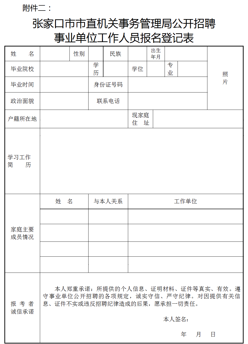 2、张家口市市直机关事务管理局公开招聘事业单位工作人员报名登记表