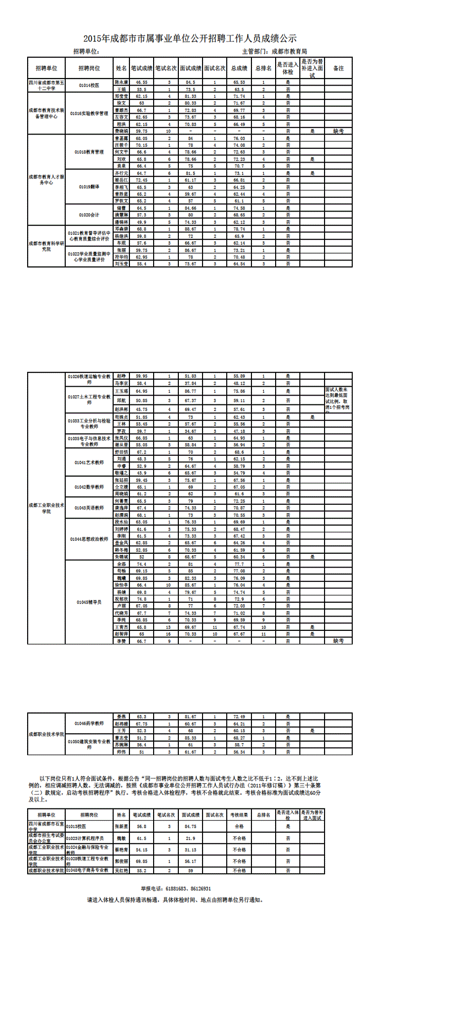 四川:2015年03月四川成都市市属事业单位招聘成绩公示