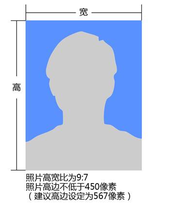 2.图像规格:照片高宽比为9:7(参见电子照片图像样例);照片高边不低于450像素(建议高边设定为567像素),图像文件大小在50kB以内,JPG格式。