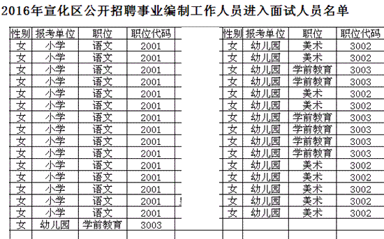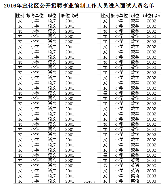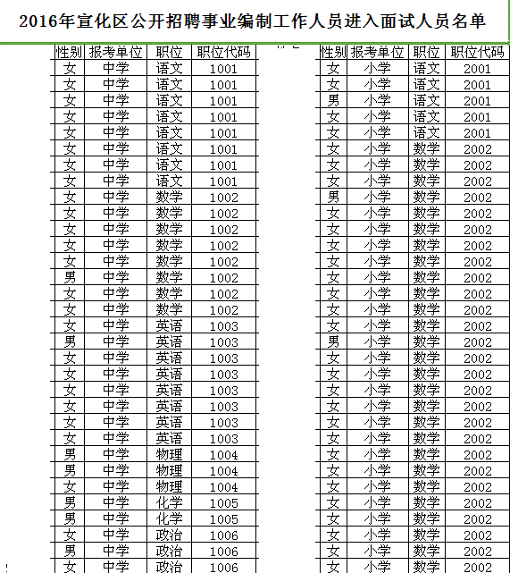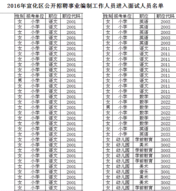 根据按笔试成绩从高到低按核定岗位人数1:1.5的比例确定参加面试人选(比例内末位笔试成绩出现并列时都进入面试)的规定,2016年宣化区公开招聘事业编制工作人员进入面试人员名单公告如下: