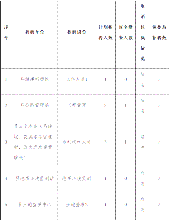 2016年磐安县事业单位公开招聘现场报名工作于2016年9月19日17:30结束。根据《2016年磐安县事业单位公开招聘工作人员公告》第十一条第6款规定,缴费确认人数不足招聘计划数3倍的岗位,将按比例核减、取消招聘计划,现将取消和核减岗位情况予以公布(见附件)。