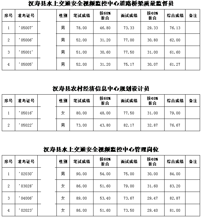 2016年汉寿县部分事业单位公开招聘工作人员考试综合成绩
