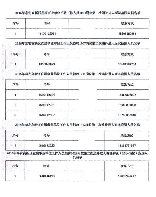 2016年泰安高新区直属事业单位公开招聘工作人员进入资格审查阶段,部分进入面试和现场解说(1014岗位)范围人员因个人原因自愿放弃,或实地核实不符合招聘条件取消面试资格。根据《2016年泰安高新区直属事业单位公开招聘工作人员公告》规定,对因放弃或取消资格造成的空缺,按考生成绩由高到低依次递补(需达到考试合格分数线)。现将第二次递补人员名单予以公布,同时对递补人员进行资格审查。现将有关事项公告如下: