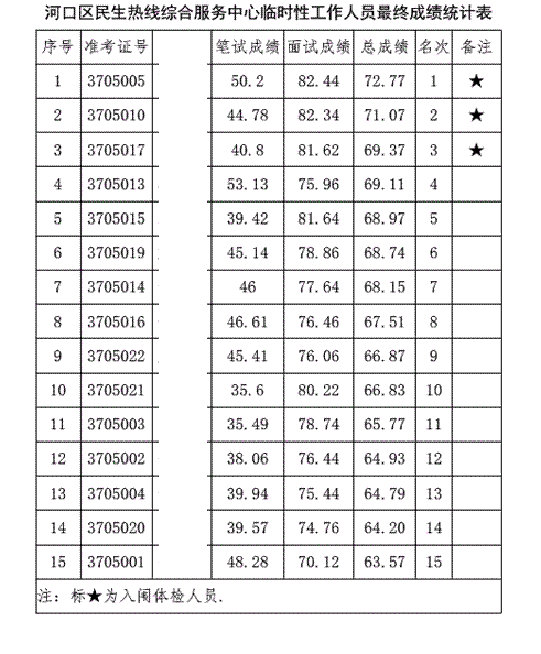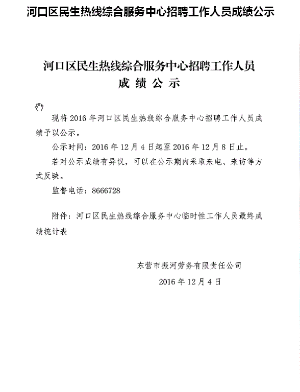 原标题:河口区民生热线综合服务中心招聘工作人员成绩公示