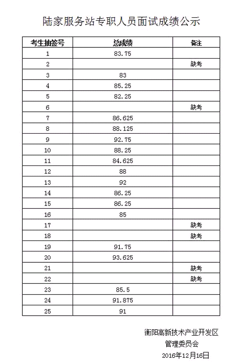 湖南:2016年12月衡阳高新区陆家服务站招聘面试成绩公告