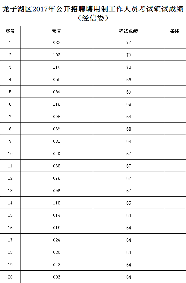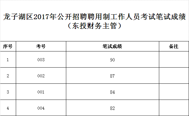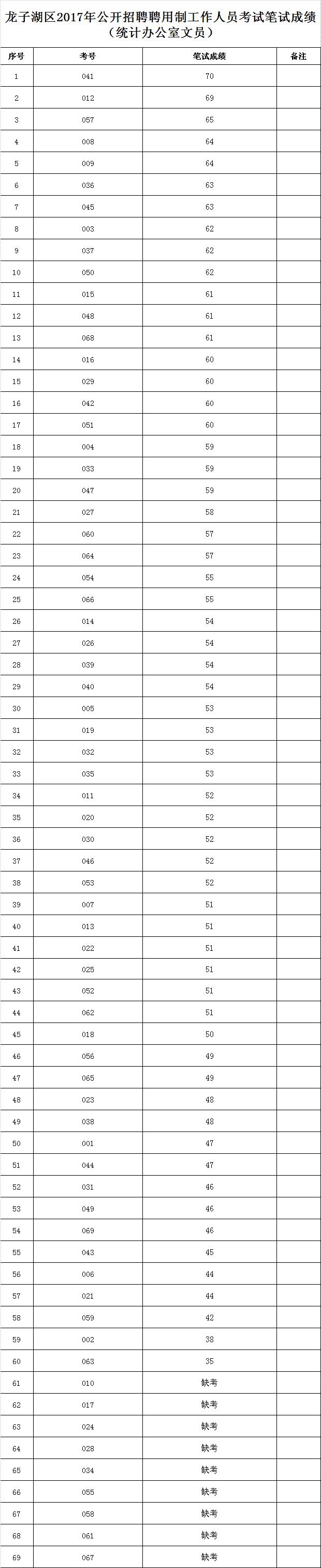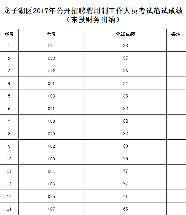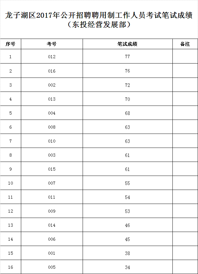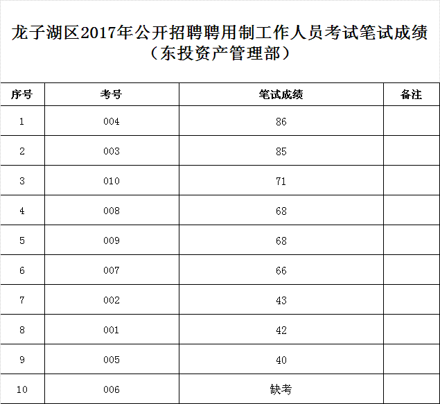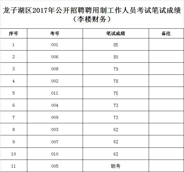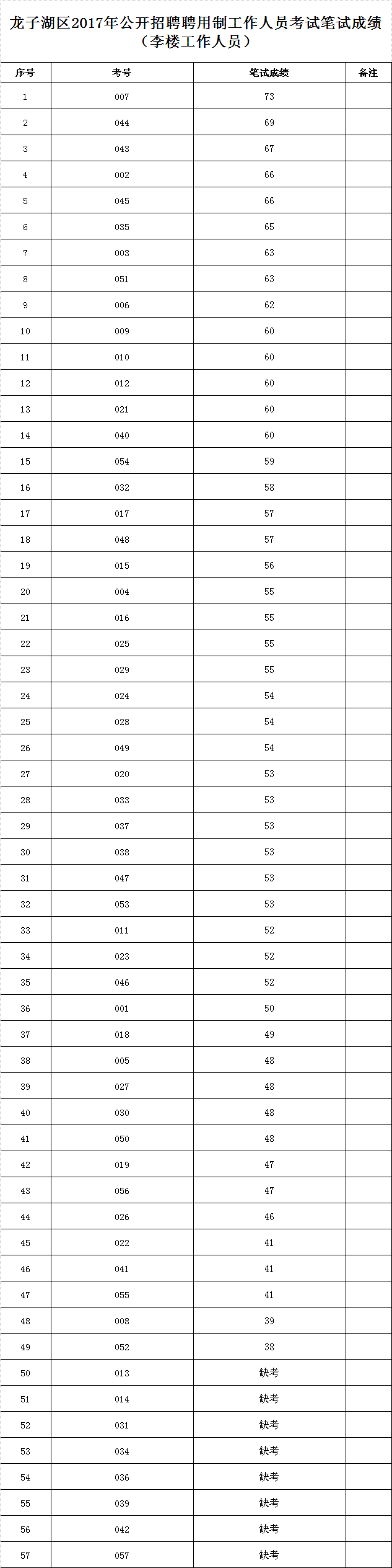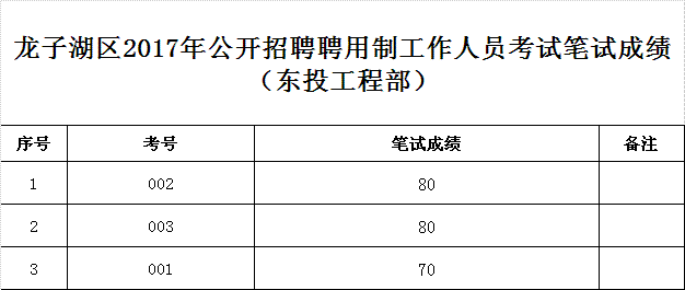 原标题:关于《龙子湖区2017年招聘聘用制工作人员》 笔试成绩的公告