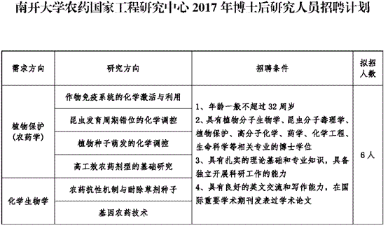 2017年南开大学农药国家工程研究中心博士后研究人员招聘计划.docx