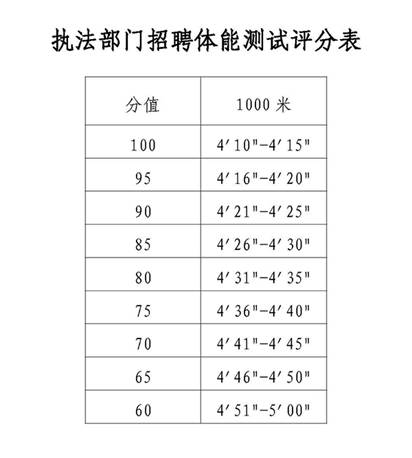 2、体能测试:报名派出所警辅岗位的预检合格人员,参加体能测试,实行淘汰制。测试科目为1000米,合格分为60分,不达合格分者直接被淘汰(具体分值详见附件3《执法部门招聘体能测试评分表》)。[page]